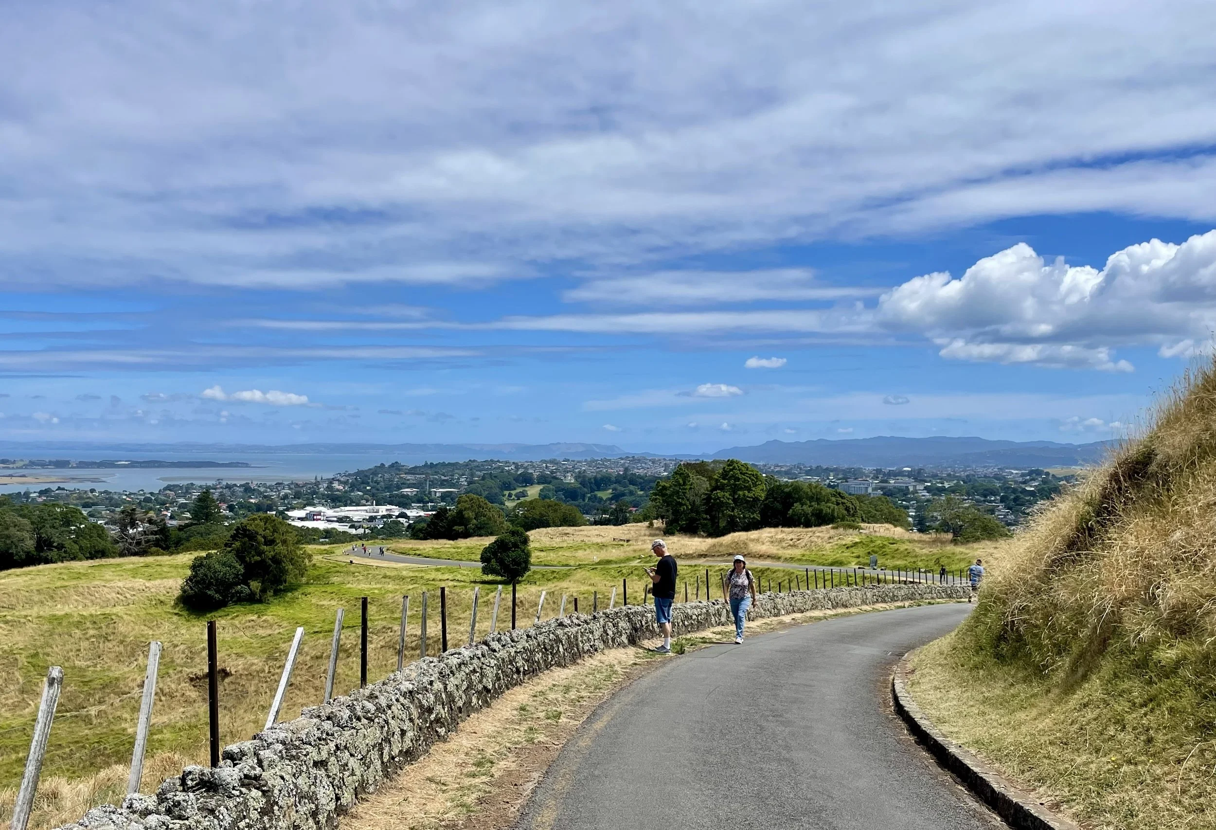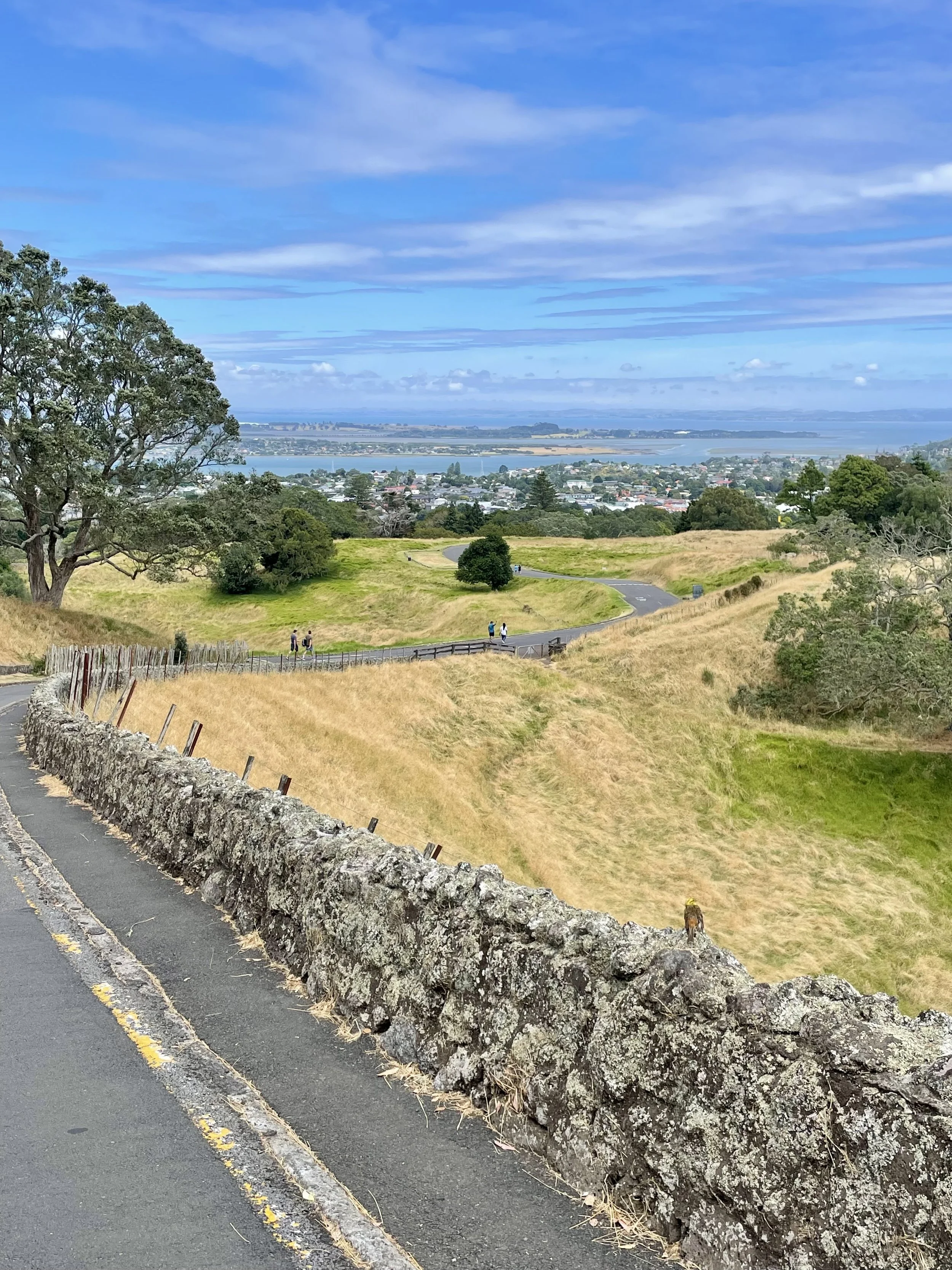 Après cette pause, je reprends la route. Tout est si serein. Je marche environ deux cents mètres avant de m’arrêter devant un portillon qui permet d’entrer dans une petite forêt reconstituée de fougères endémiques. Les oiseaux volent dans et chantent dans cet espace ombragé par les grandes plantes qui y trônent fièrement. J’en sors au bout de quelques pas pour me retrouver sous une forêt de majestueux pins. Un peu plus loin, des moutons mangent de l’herbe. C’est la première fois que j’en vois depuis mon arrivée dans le pays réputer pour avoir six fois plus de moutons que d’habitants. Les couleurs de cette scène sont agréables, apaisantes. Les vieux chênes qui siègent au milieu font de leur cour de récréation un paradis. Sans savoir où je vais, je continue à marcher, je monte et voilà que l’obélisque de la One Tree Hill s’impose dans le paysage qui devient un vaste champ de paille des deux côtés de la route. Il fait bien chaud, sans l’ombre des arbres. La montée est rude, un petit oiseau à la tête jaune me surprend, posé sur le muret et si proche de moi. Je m’arrête, je le regarde, il me regarde. Il chante, quel beau chant. Arrivé en haut, je profite du panorama.