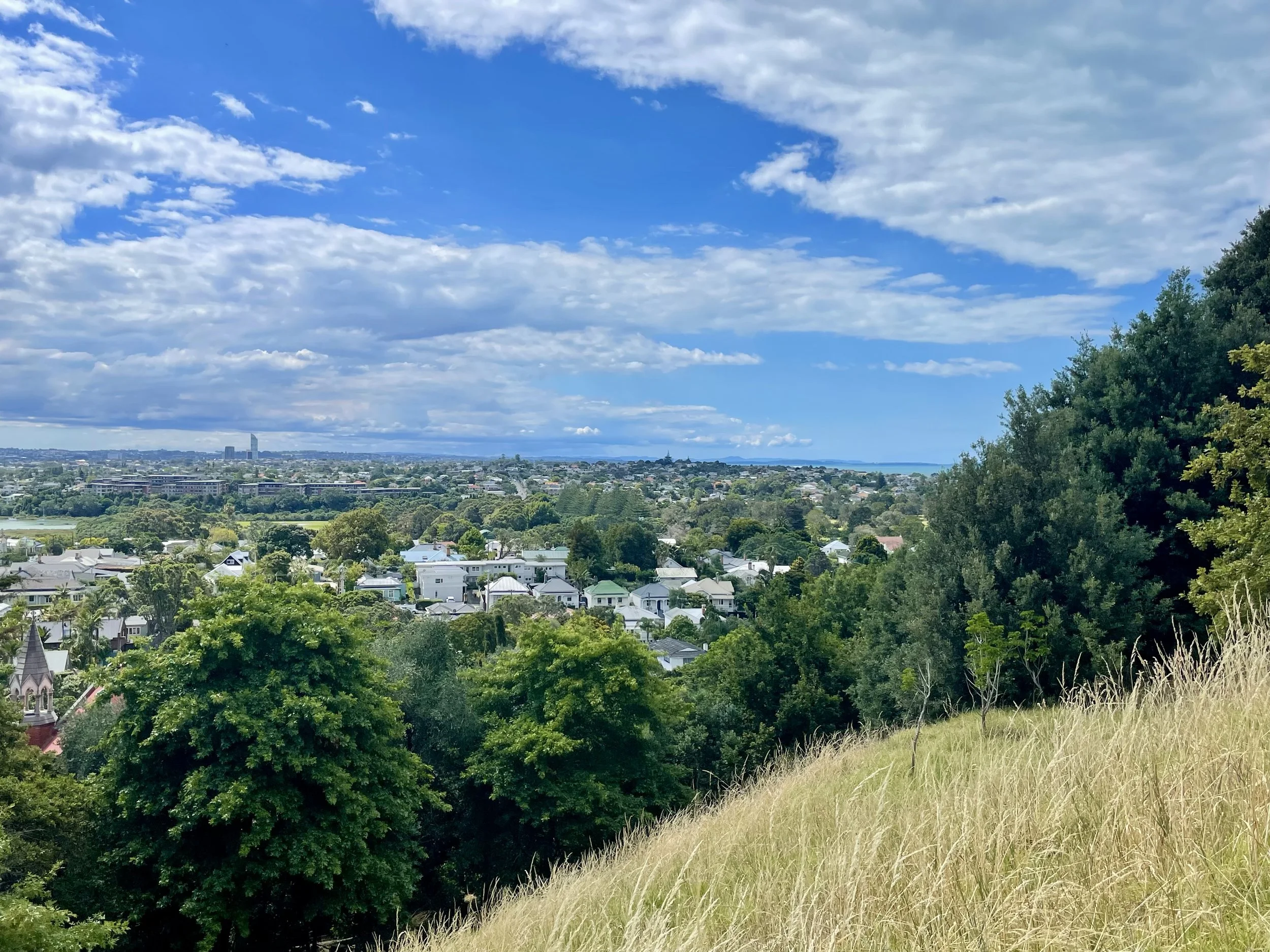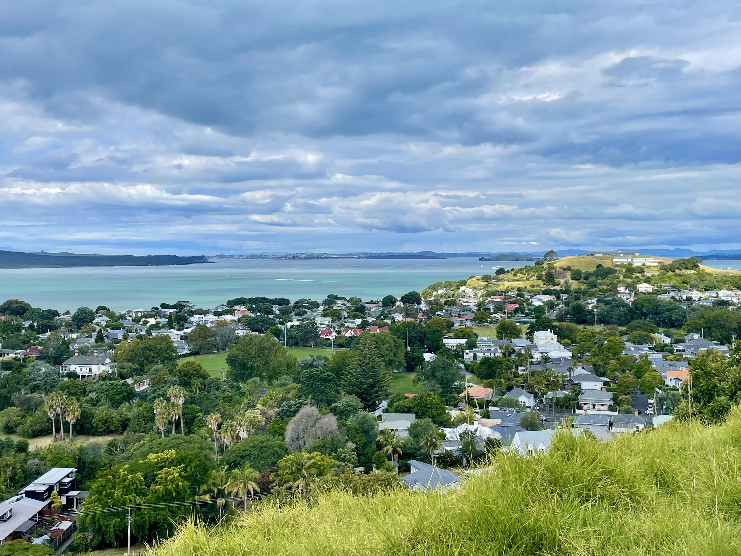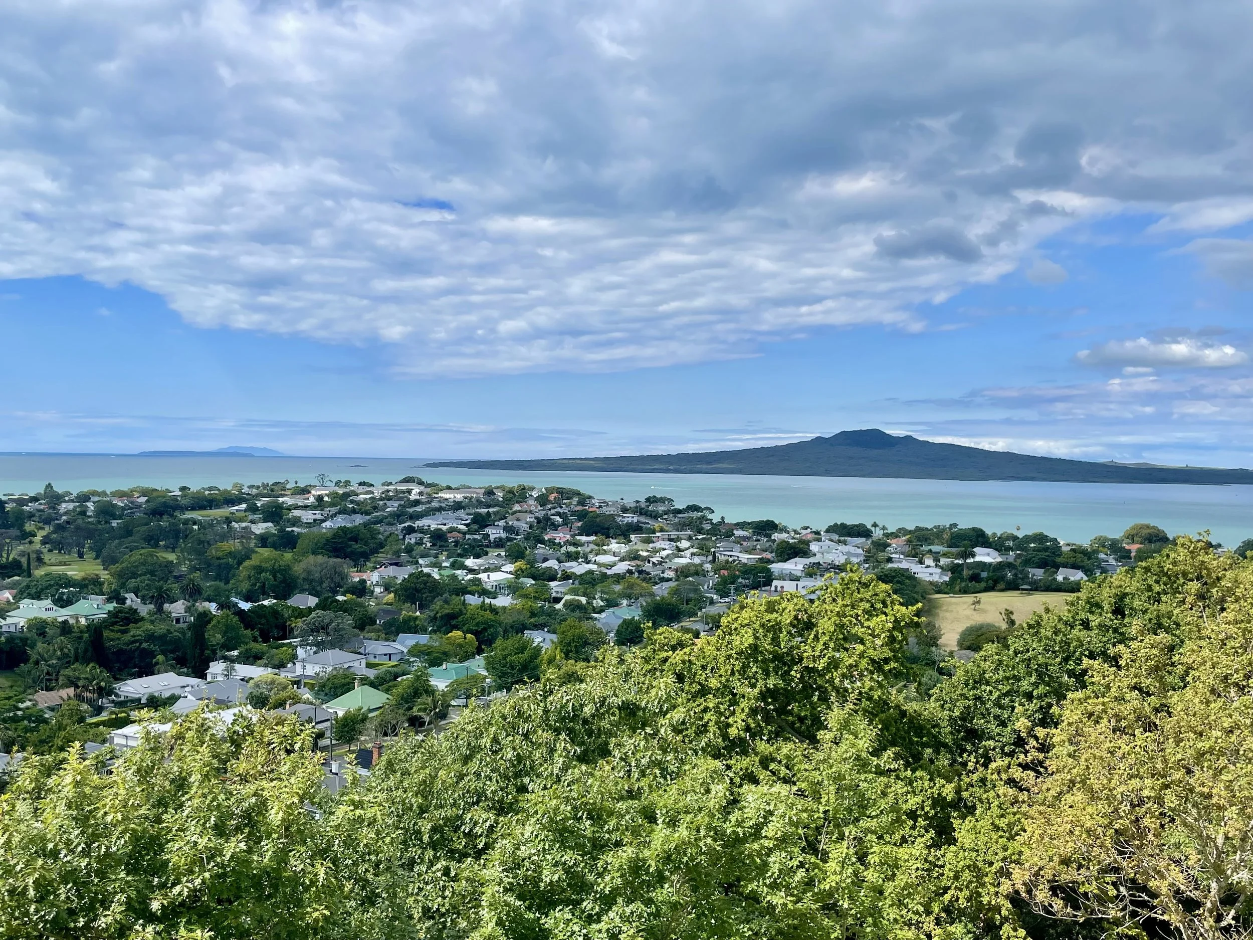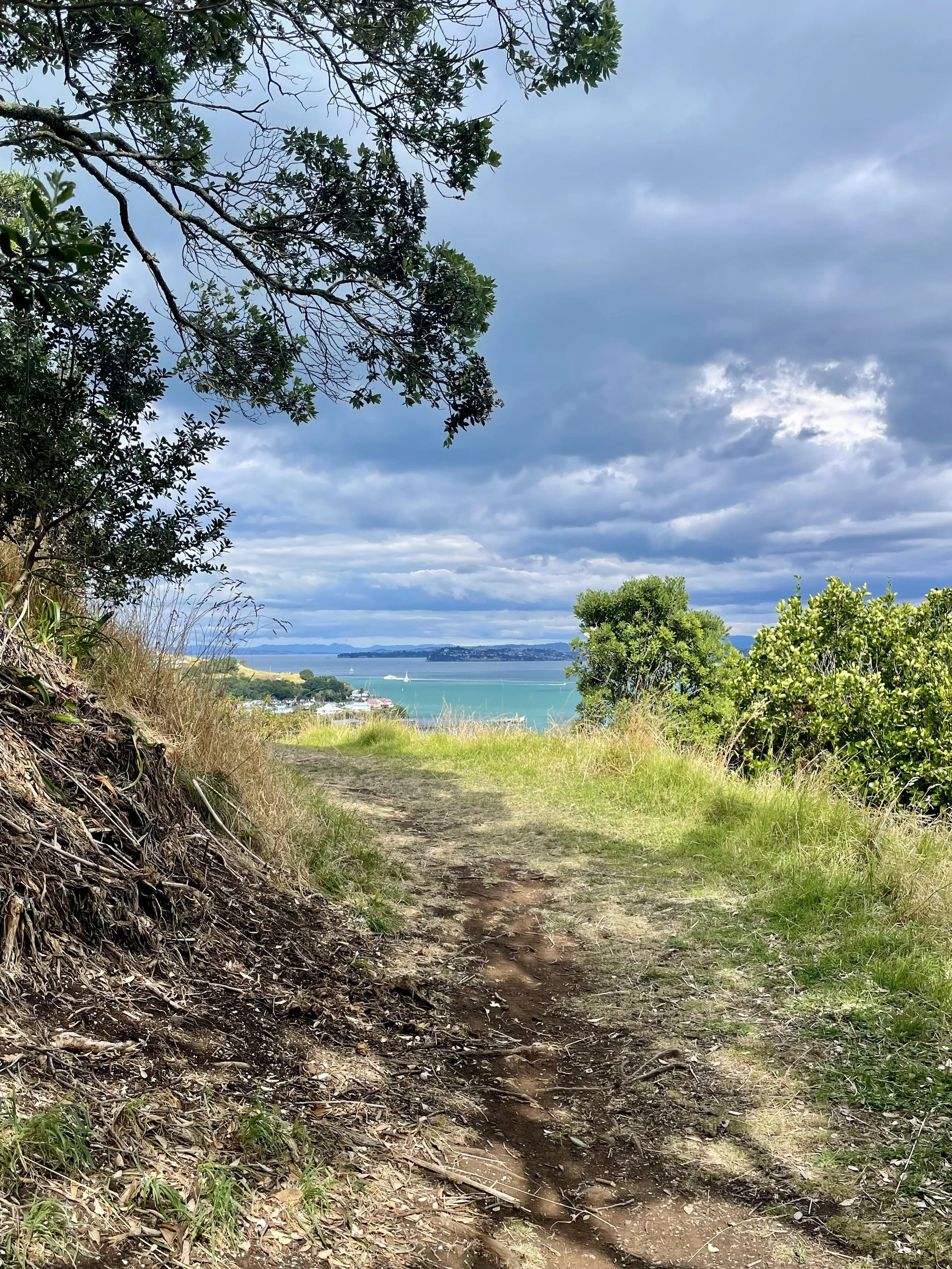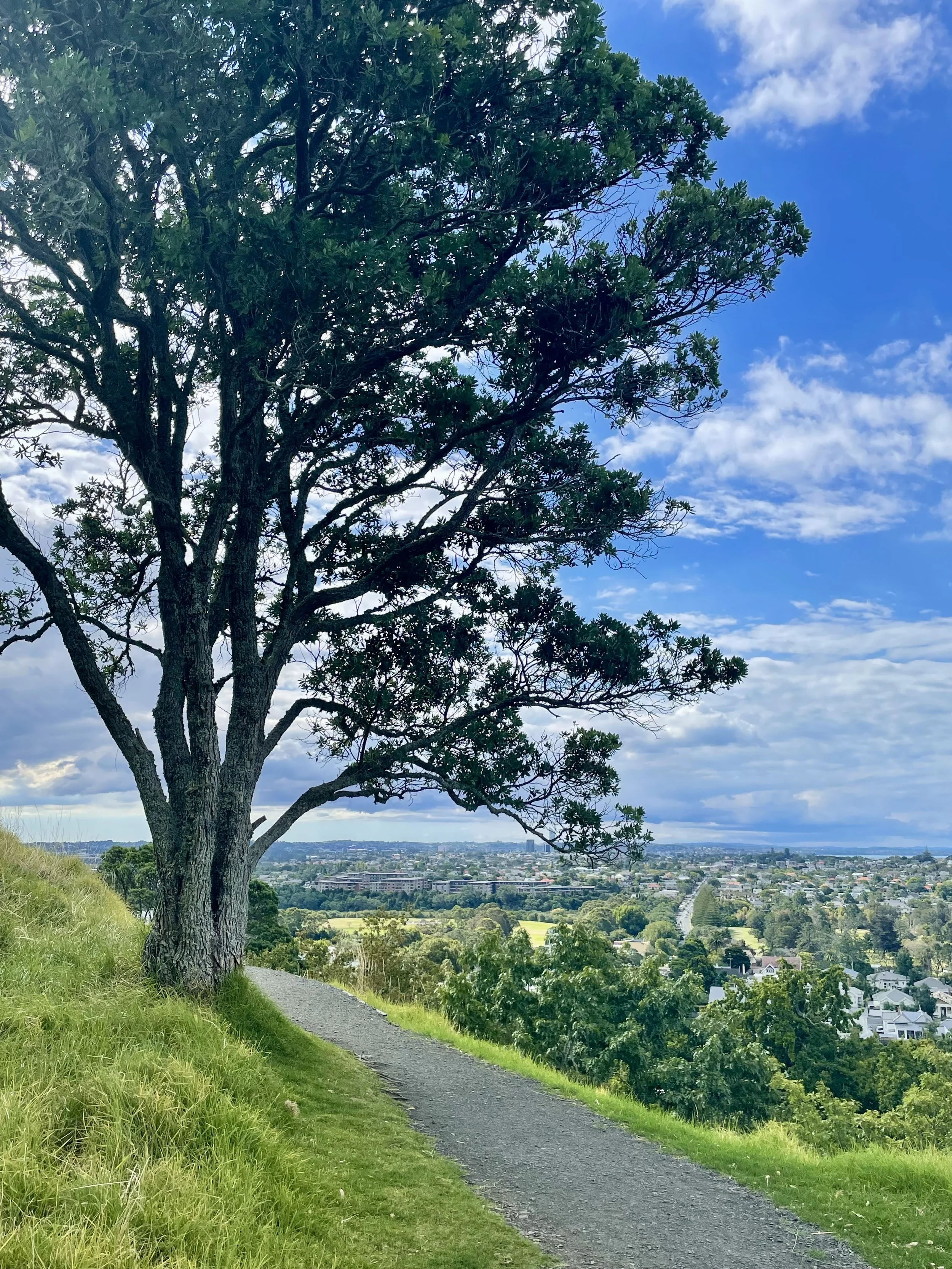 Je reprends ma route amusé par cette jolie dédicace. Deux pas plus loin, un arbre majestueux attire mon attention. Si grand, au branches monumentales dont certaines deviennent des racines, me laisse bouche-bée. Bon cette fois, je reprends ma route vers le sommet. Tout au long de l'ascension, le paysage s’offre au regard. Je n’ai plus de mots pour décrire, je vous laisse regarder les photos. Je trouve un banc où je m’assois face à Rangitoto. Un petite pause avant de reprendre le chemin, la descente puis le ferry.