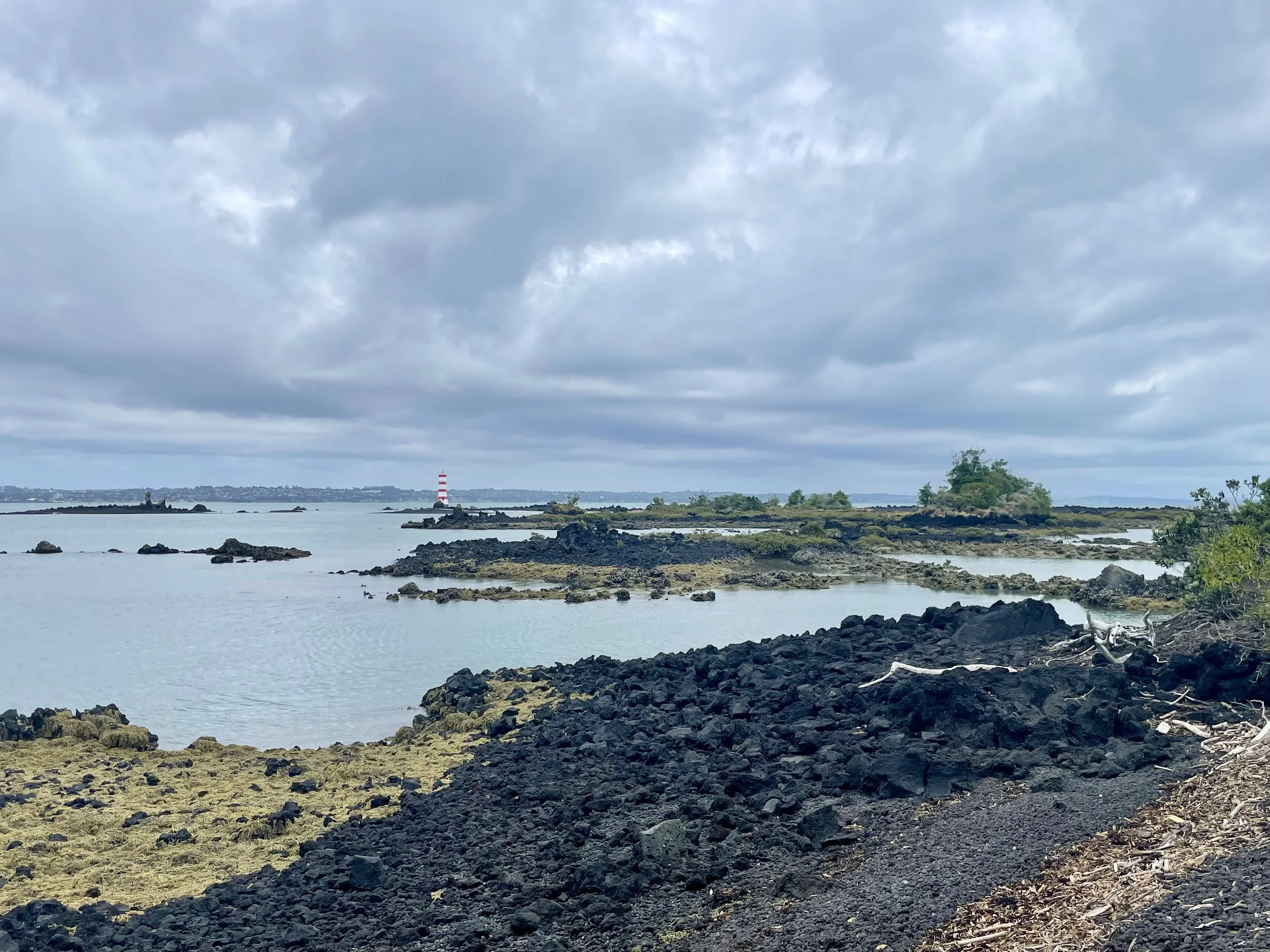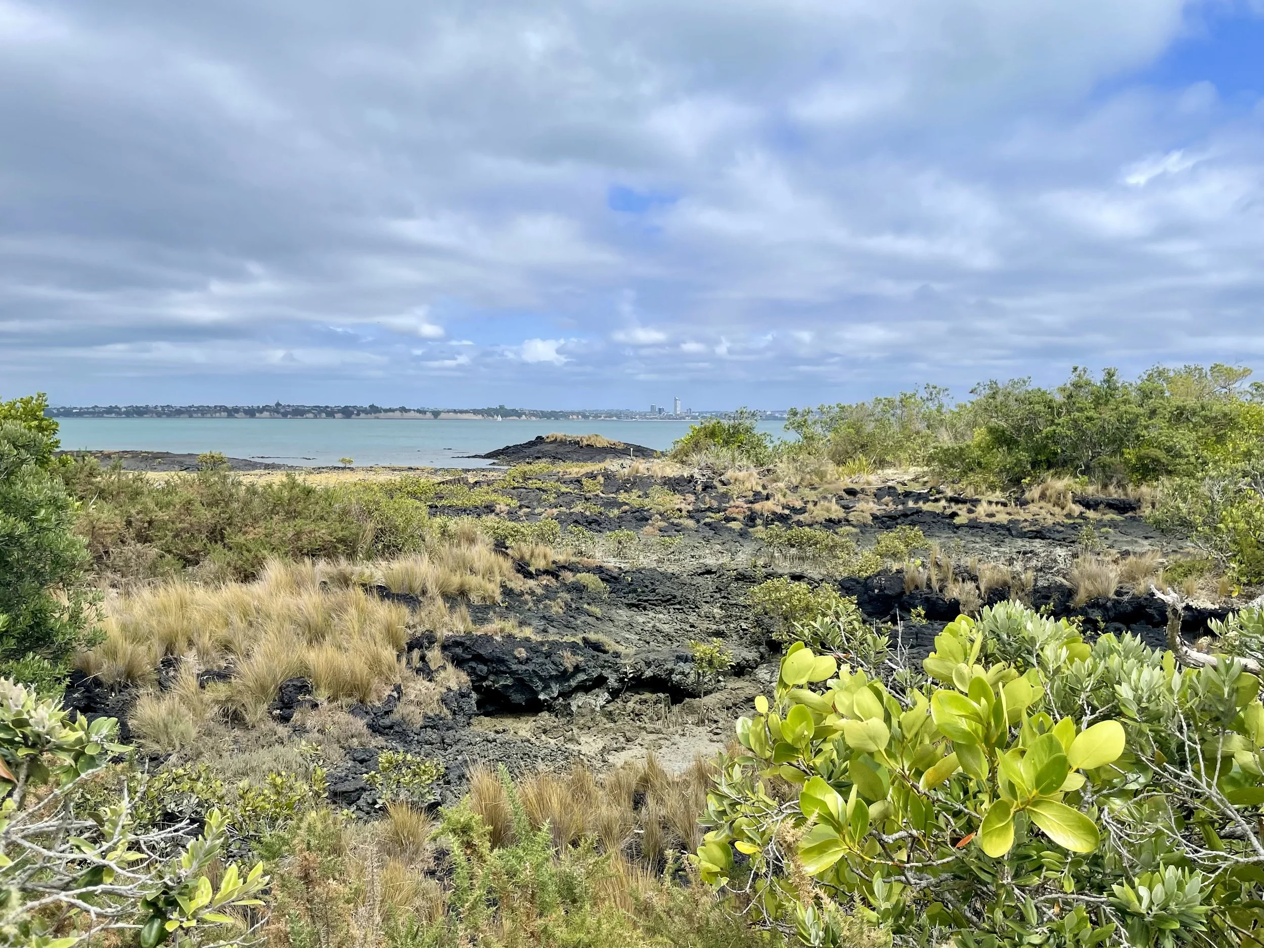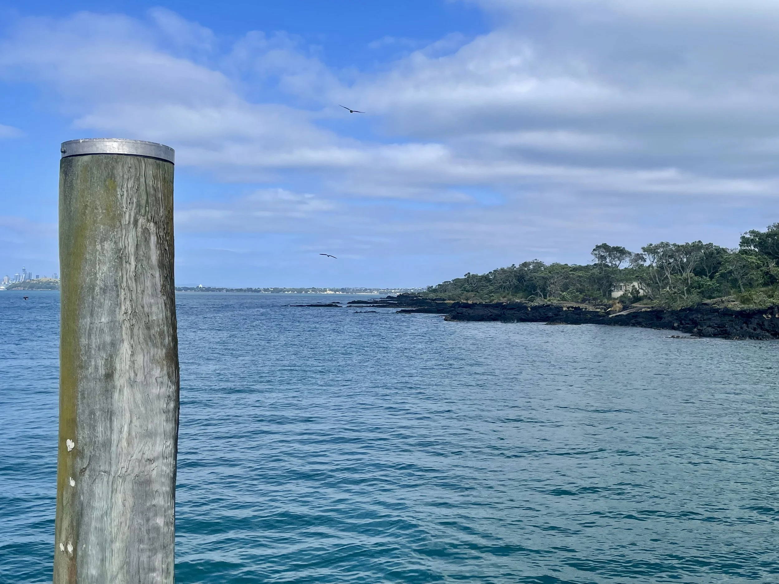 Rendez-vous donné à 8h pour le petit-déjeuner, il arrive à 8h05 — je note le progrès, ça l’amuse —. Une petite chocolatine pour moi, un croissant aux amandes pour lui, et chacun un cappuccino. Je le prépare mentalement à ma lenteur de marche qui l’exaspère. Notre ferry est à 9h30, il ne faut pas le louper, il n’y en a pas beaucoup, et le dernier qui repart de l’ile pour Auckland est à 15h30. Cette journée ensoleillée présage d’une belle randonnée. On a tout prévu : crème solaire, chaussures de marche, beaucoup d’eau et les sandwichs. A l’embarquement, le personnel de la compagnie nous explique les règles pour préserver la richesse de l’île, et ça commence sur les quais du port, en brossant les chaussures avant d’entrer sur le bateau. Les vingt-huit-cinq minutes de traversée permettent à nouveau de profiter d’une belle vue. Et quelle vue à l’approche de Rangitoto ! Prêts à bien marcher, c’est l’heure de débarquer, 4h30 top chrono.