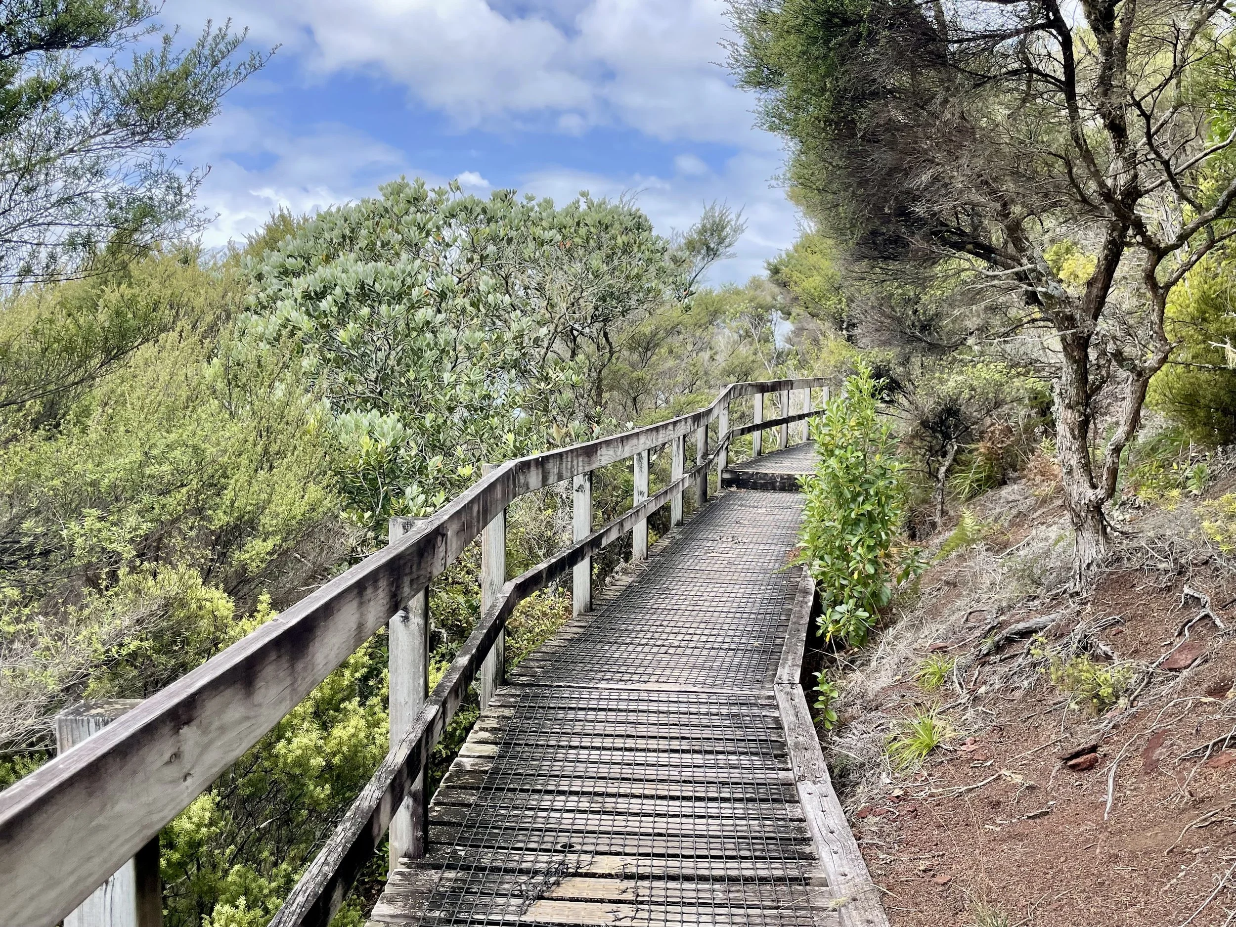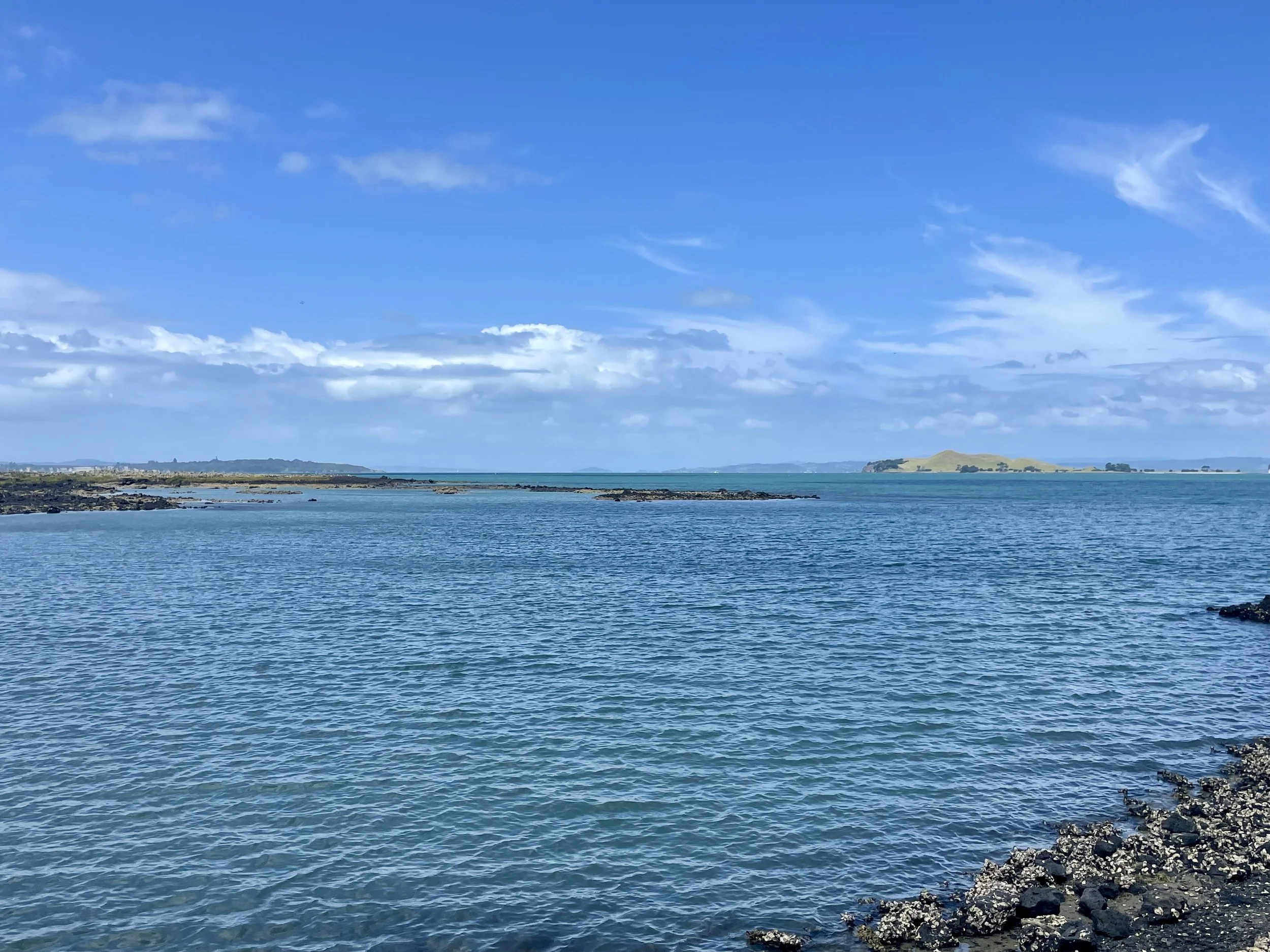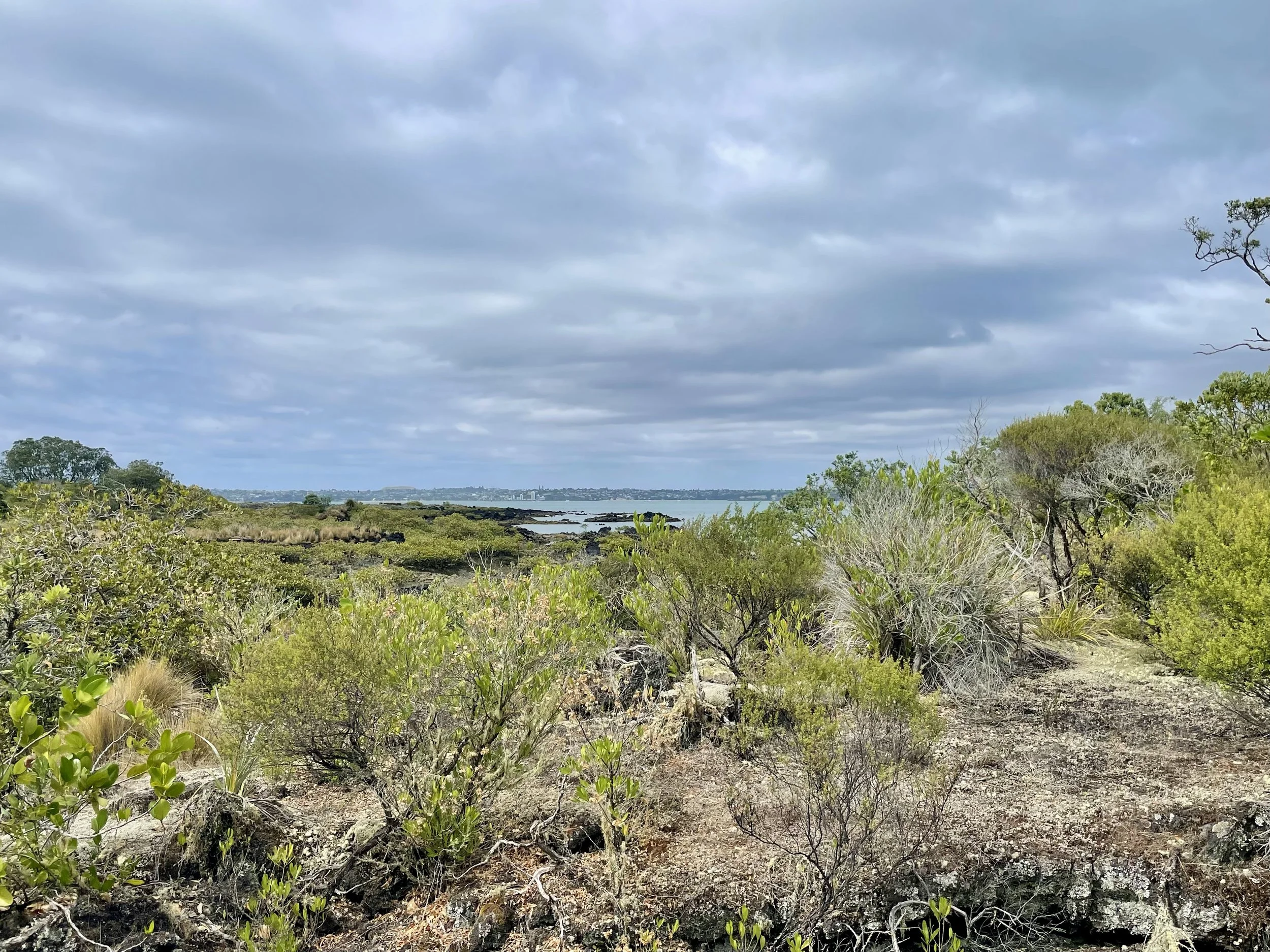 Rendez-vous donné à 8h pour le petit-déjeuner, il arrive à 8h05 — je note le progrès, ça l’amuse —. Une petite chocolatine pour moi, un croissant aux amandes pour lui, et chacun un cappuccino. Je le prépare mentalement à ma lenteur de marche qui l’exaspère. Notre ferry est à 9h30, il ne faut pas le louper, il n’y en a pas beaucoup, et le dernier qui repart de l’ile pour Auckland est à 15h30. Cette journée ensoleillée présage d’une belle randonnée. On a tout prévu : crème solaire, chaussures de marche, beaucoup d’eau et les sandwichs. A l’embarquement, le personnel de la compagnie nous explique les règles pour préserver la richesse de l’île, et ça commence sur les quais du port, en brossant les chaussures avant d’entrer sur le bateau. Les vingt-huit-cinq minutes de traversée permettent à nouveau de profiter d’une belle vue. Et quelle vue à l’approche de Rangitoto ! Prêts à bien marcher, c’est l’heure de débarquer, 4h30 top chrono.