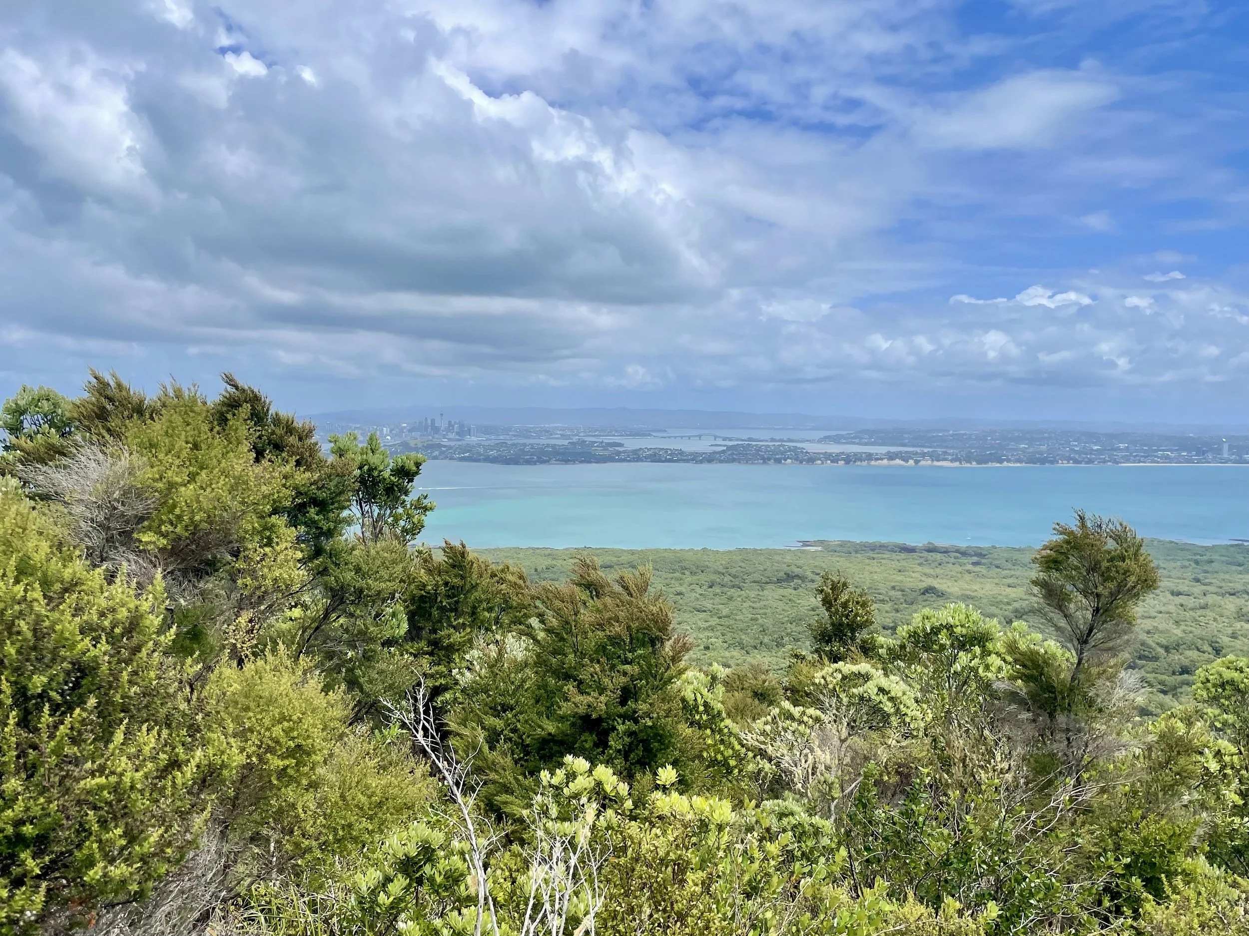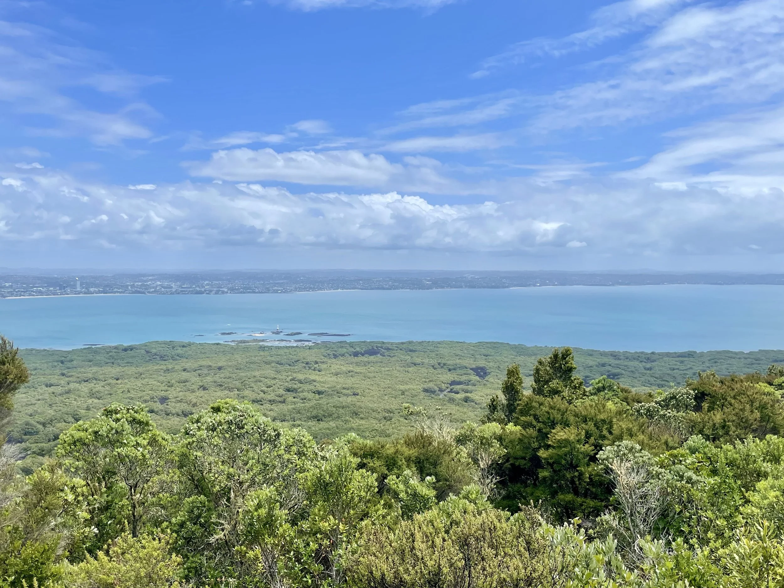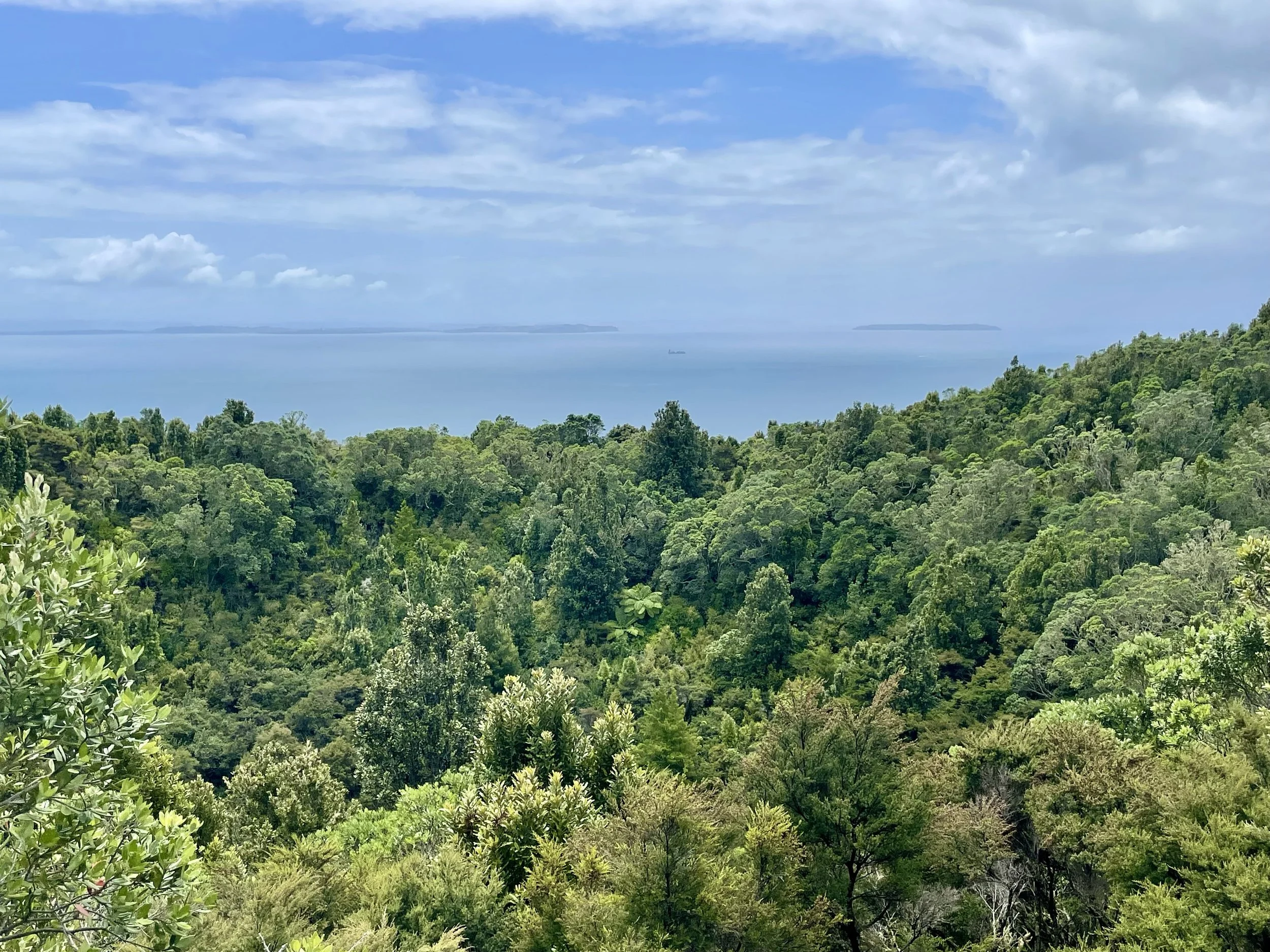 Vers 12h30, assez avancés et rassurés que nous ayons bien avancés, nous prenons une pause pique-nique. On s’est assis le long du chemin, sur la roche volcanique qui nous a servi de banc. Après avoir repris des forces, nous avons repris le rythme sur le chemin qui désormais à la pente abrupte nous conduisait au sommet du volcan. Le chemin était maintenant différent. Nous étions à nouveau dans une végétation dense au milieu de grands arbres. Petit à petit, la vue se dégage, on regarde la beauté du paysage. Arrivé au sommet, le cratère, et le panorama. Encore une fois, je n’ai pas les mots pour raconter l’essentiel, peut-être parce qu’il ne se raconte pas ; il se vit, il s’admire. La descente est plus facile. Nous arrivons dix minutes avant que le dernier ferry de la journée ne parte. Une petite sieste dans le ferry. Puis une glace chez Giapo, les meilleures d’Auckland. C’était une super randonnée.