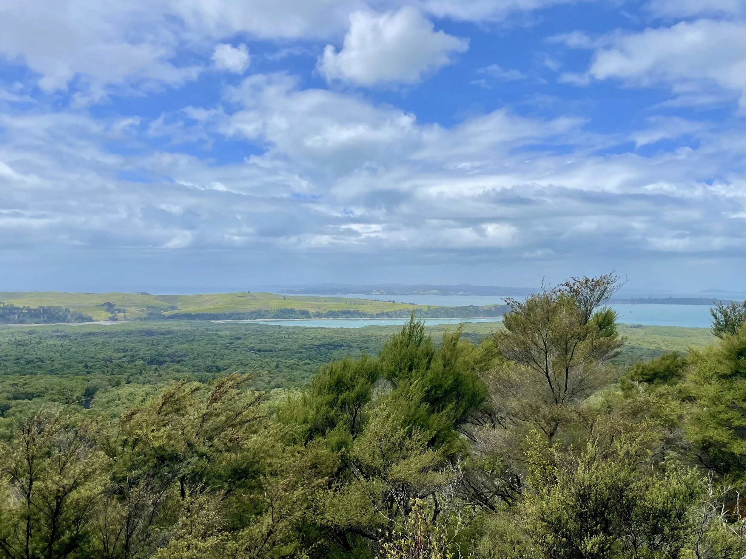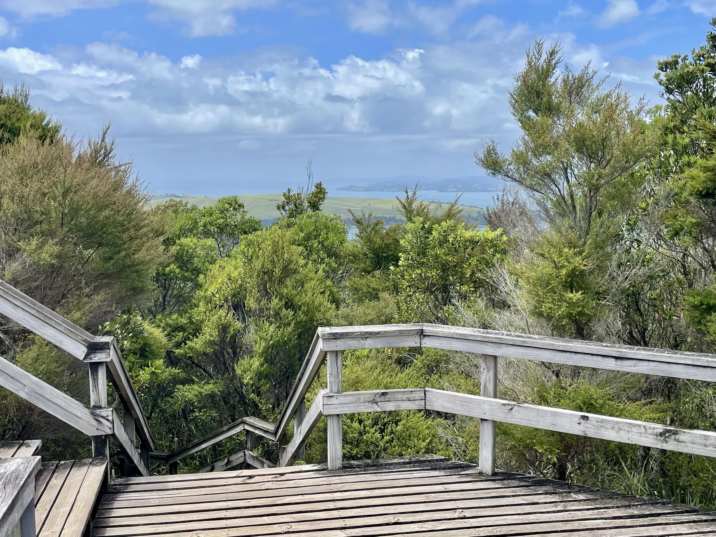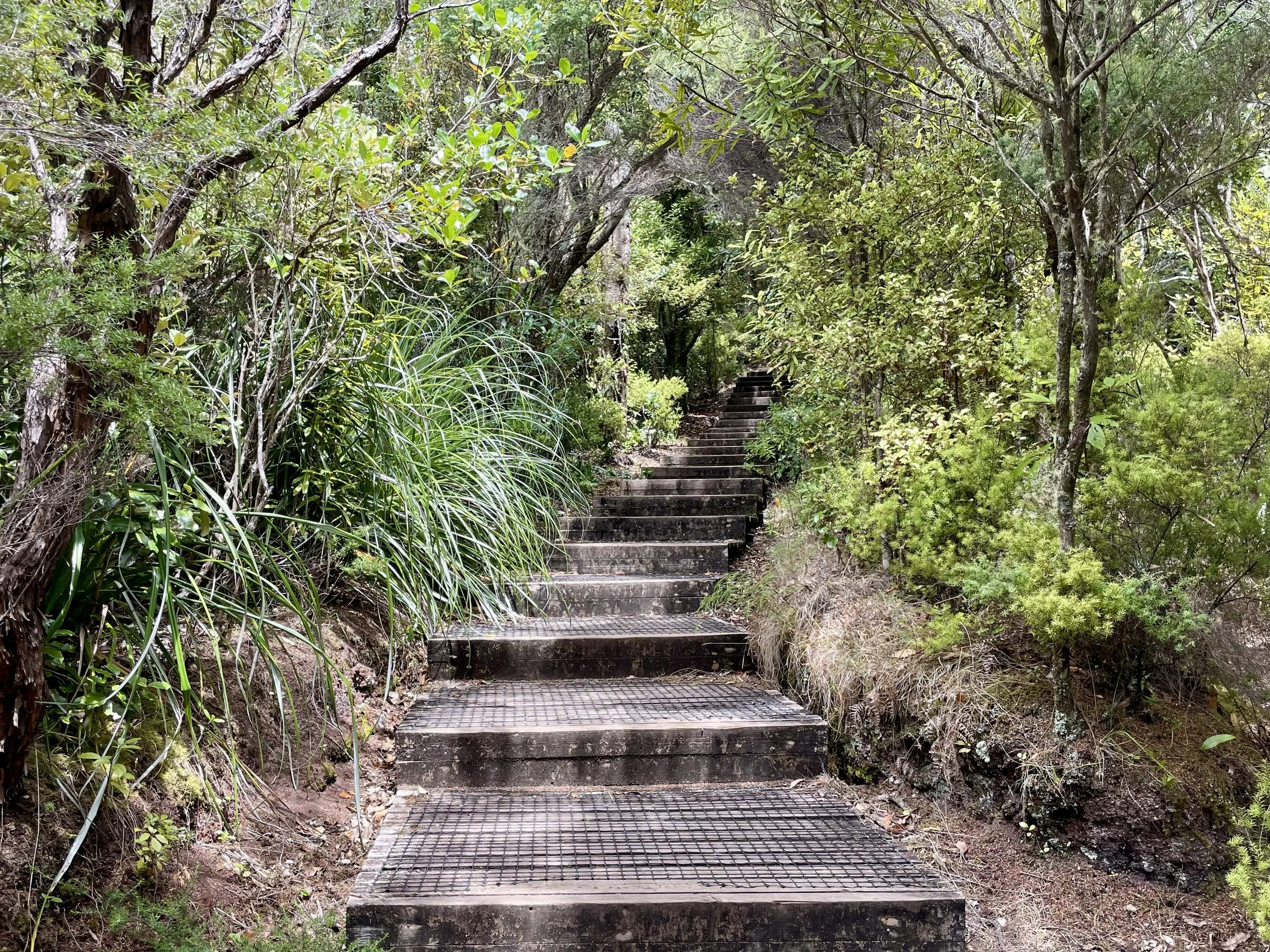 Vers 12h30, assez avancés et rassurés que nous ayons bien avancés, nous prenons une pause pique-nique. On s’est assis le long du chemin, sur la roche volcanique qui nous a servi de banc. Après avoir repris des forces, nous avons repris le rythme sur le chemin qui désormais à la pente abrupte nous conduisait au sommet du volcan. Le chemin était maintenant différent. Nous étions à nouveau dans une végétation dense au milieu de grands arbres. Petit à petit, la vue se dégage, on regarde la beauté du paysage. Arrivé au sommet, le cratère, et le panorama. Encore une fois, je n’ai pas les mots pour raconter l’essentiel, peut-être parce qu’il ne se raconte pas ; il se vit, il s’admire. La descente est plus facile. Nous arrivons dix minutes avant que le dernier ferry de la journée ne parte. Une petite sieste dans le ferry. Puis une glace chez Giapo, les meilleures d’Auckland. C’était une super randonnée.